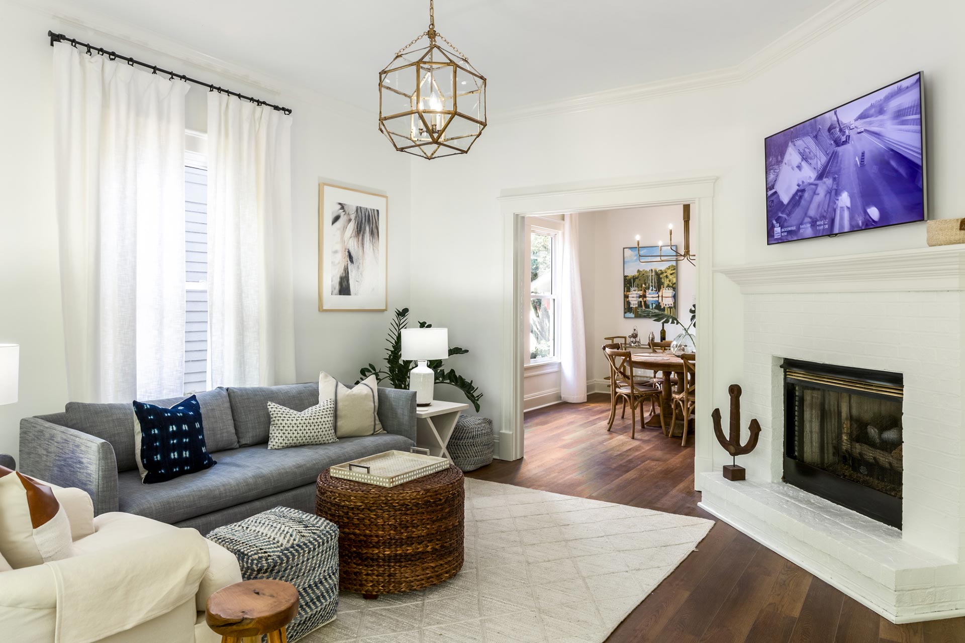 We started with fresh paint on the walls and fireplace in SW Chantilly Lace. For the color palette, I drew inspiration from Beaufort’s coastal setting—using white, sand, brown, and shades of blue throughout the home. When we opened the shutters, light flooded into the room. So, we replaced them with Pottery Barn curtains, hanging them close to the ceiling to highlight the height of the room. A Serena & Lily light jute rug lightened up the dark floors, and Pottery Barn lamps on each side table also light to the room.