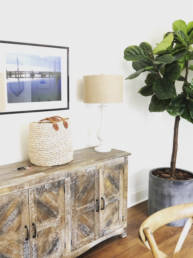A space that’s well-balanced and has natural elements feels harmonious. The artwork needed to be relaxing and soothing. We were thrilled to feature original art from two local artists. Natural materials are great and here we included wood, seagrass, raffia, and linen. The large fig tree and monstera leaves are artificial, but you’d never know it in photographs or in person. World Market is my go-to source for greenery. I like to play with a variety of shapes in a room, including both round and rectangular pieces.